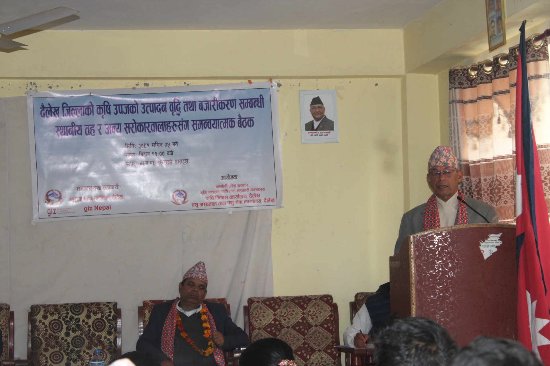 जिल्ला स्थित ११ वटै स्थानीय तहका जनप्रतिनिधिहरु तथा स्थानीय तहका प्रमुख प्रशासकीय अधिकृत, कृषि तथा पशुपन्छी शाखाका प्रमुखहरुको सहभगीतामा उक्त बैठक गरिएको कृषि विकास कार्यालय दैलेका प्रमुख राजु भुजले बताए।