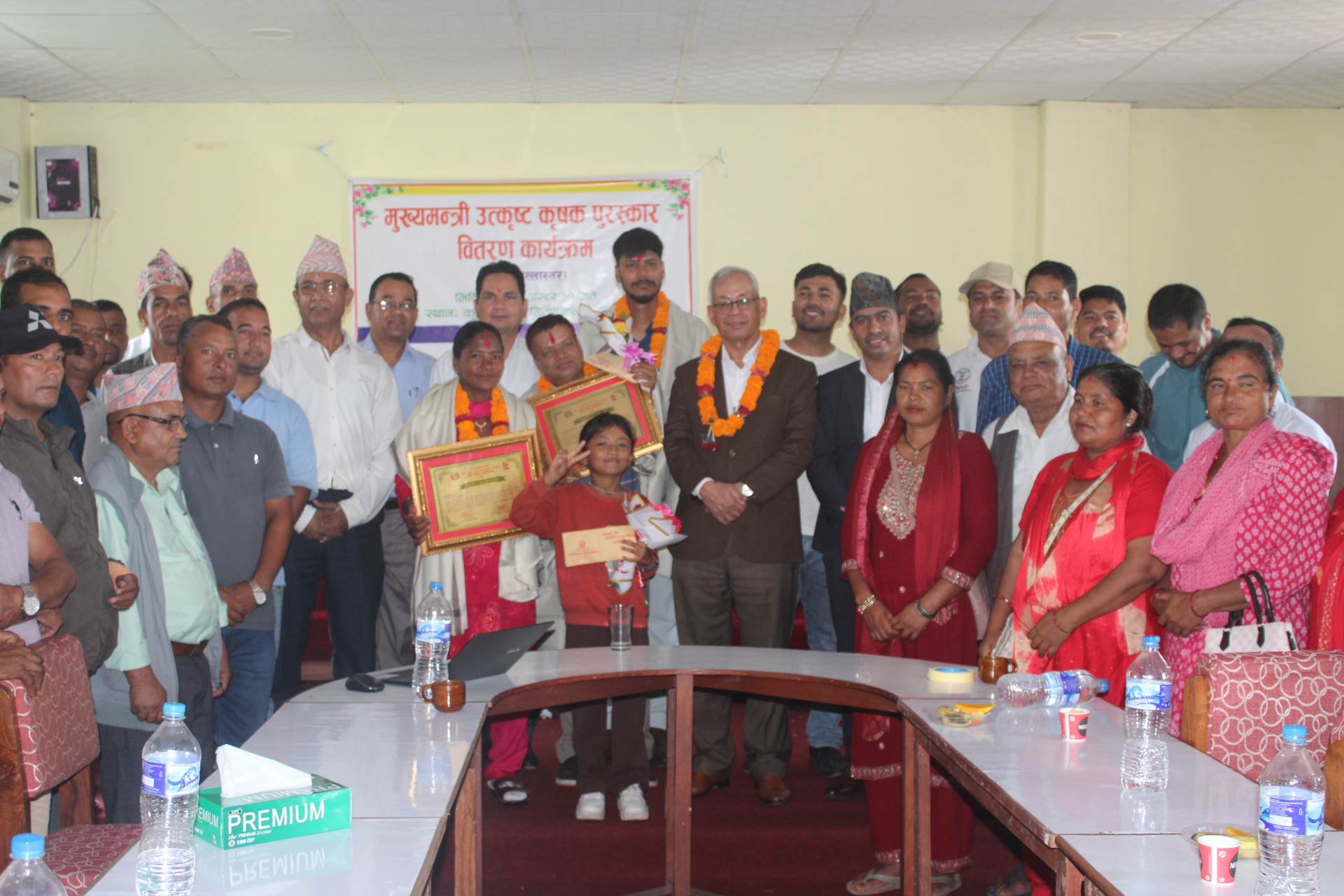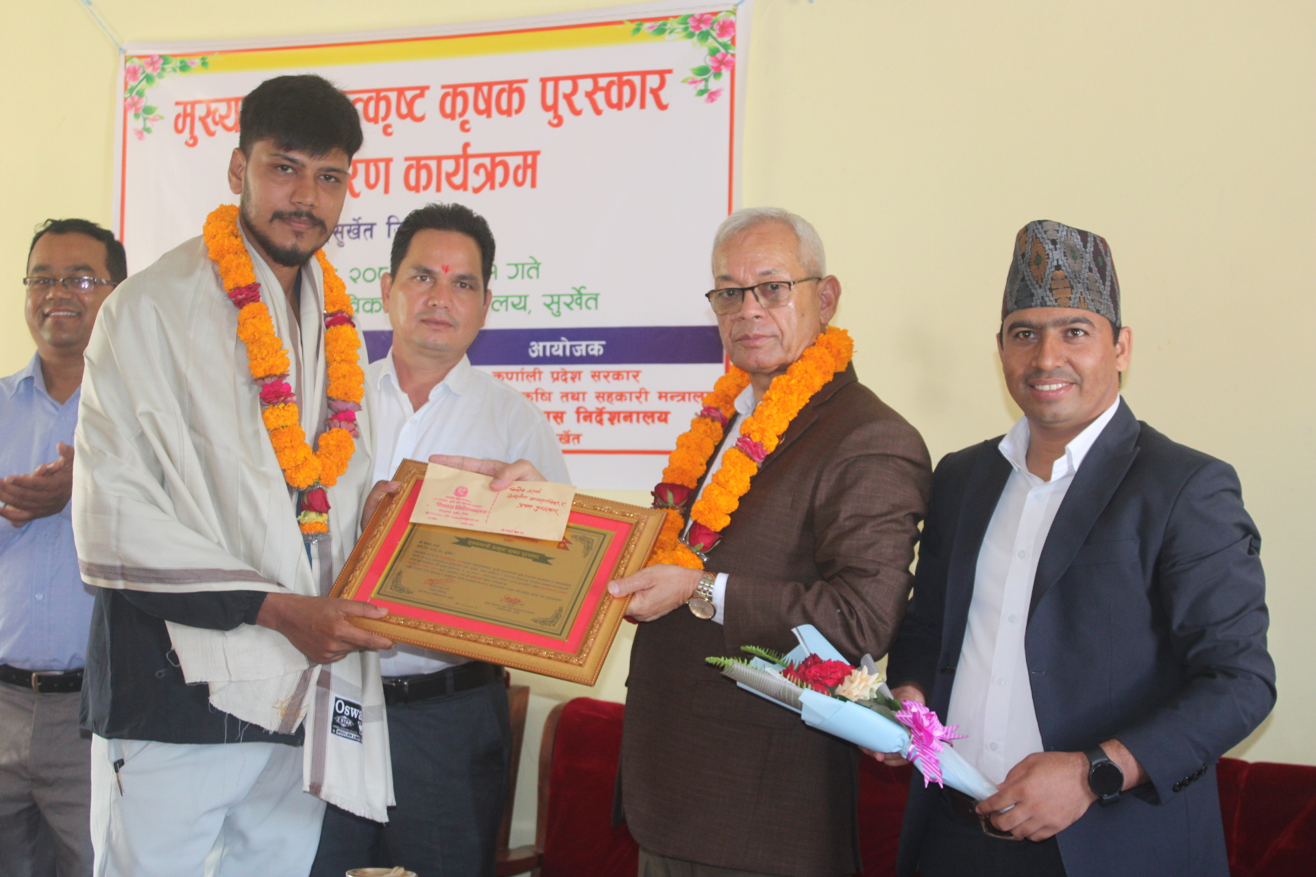 सुर्खेत । सुर्खेत जिल्लाका तीन जना किसानलाई मुख्यमन्त्री उत्कृष्ट कृषक पुरस्कार प्रदान गरिएको छ। भूमि व्यवस्था, कृषि तथा सहकारी मन्त्रालय अन्तरगतको कृषि विकास निर्देशनालयले सुर्खेत जिल्लास्तरका तीन किसालाई पुरस्कार प्रदान गरेको हो।